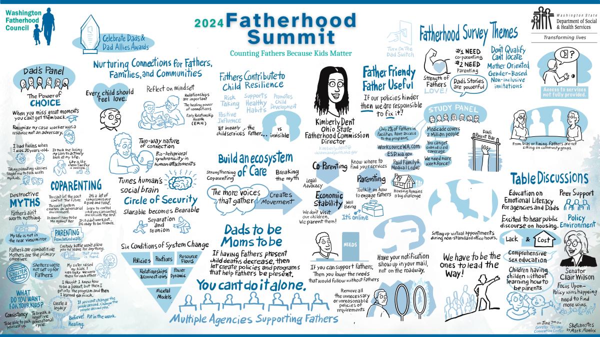 Thank you to the more than 300 fathers, local and state organizations and dad allies who attended the 2024 Fatherhood Summit. Together, we explored the findings of the Washington Fatherhood Study and spent the day discovering how we can work together to support fathers, children, families, and communities in Washington state.